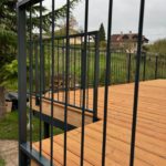 Terrasse posée à Ependes !Structure métallique thermolaquée dont une partie a été réemployée. Carrelets en chêne et lames de terrasse en pin brossé. Balustrade en acier thermolaqué.