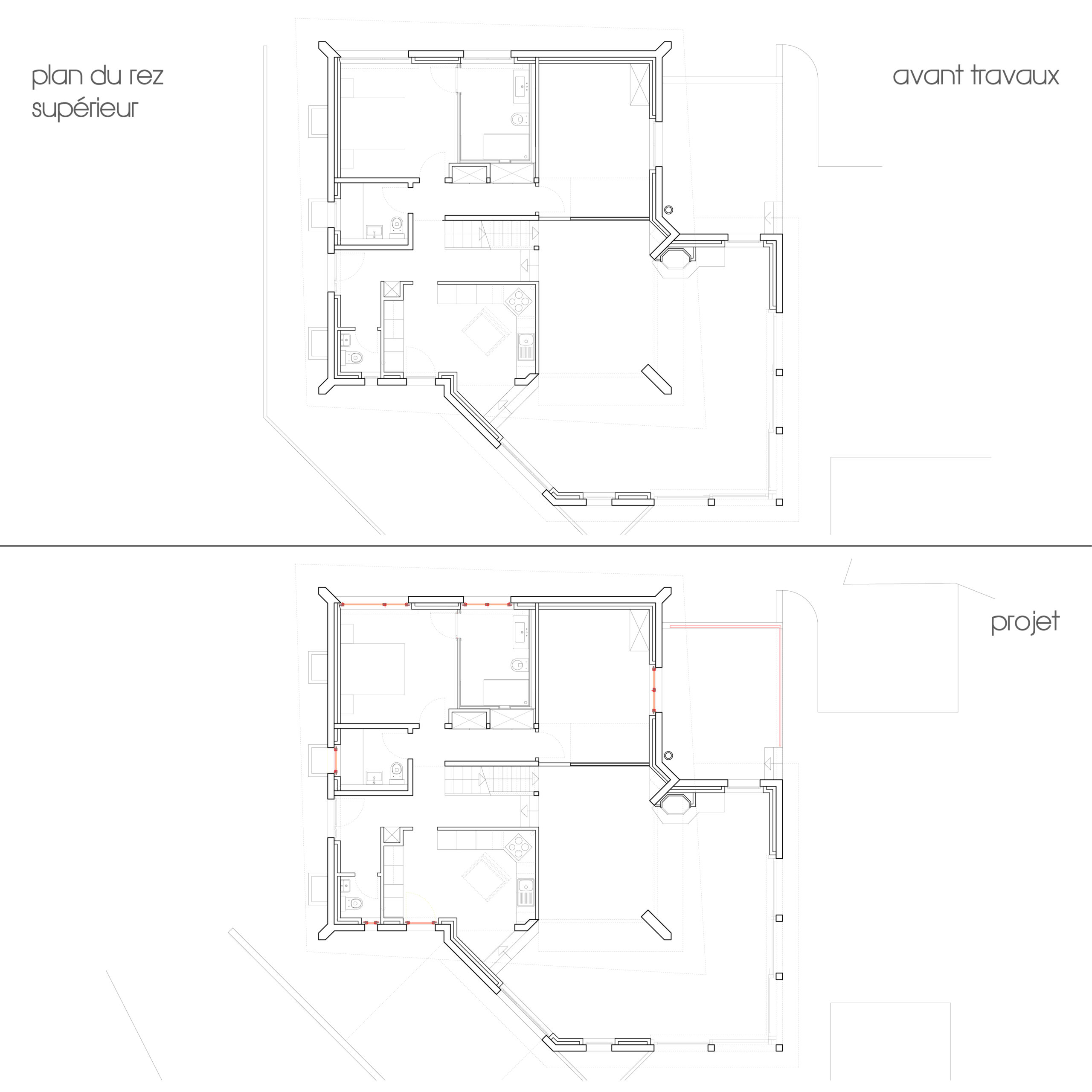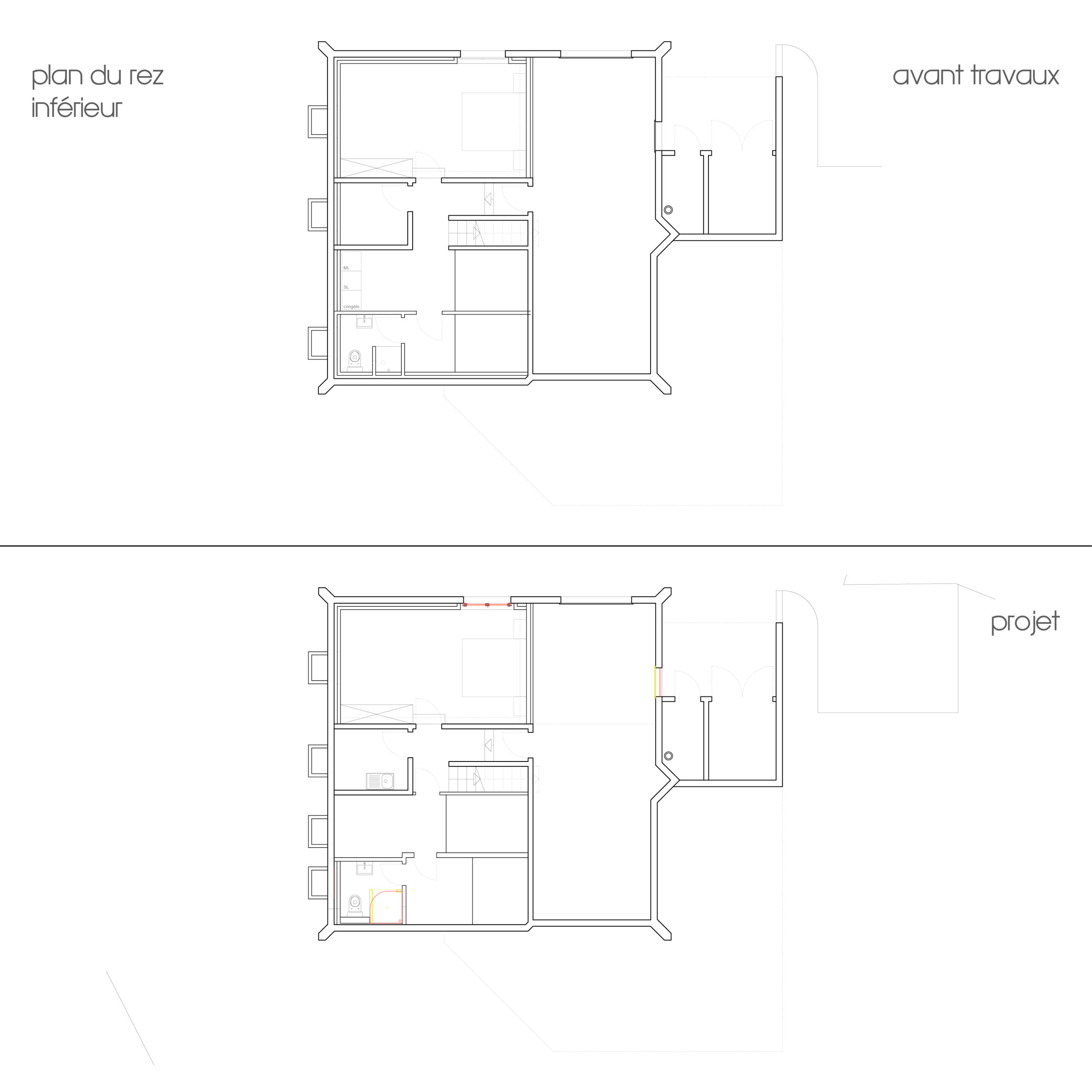 - Changement de la salle de bain du rez-de-chaussée inférieur (nouveaux appareils, nouveaux revêtements) et assainissement